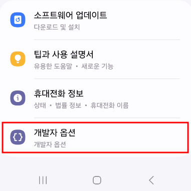 개발자 옵션이 정상적으로 활성화 돼서 메뉴에 보이는 걸 확인하실 수 있습니다 ^^